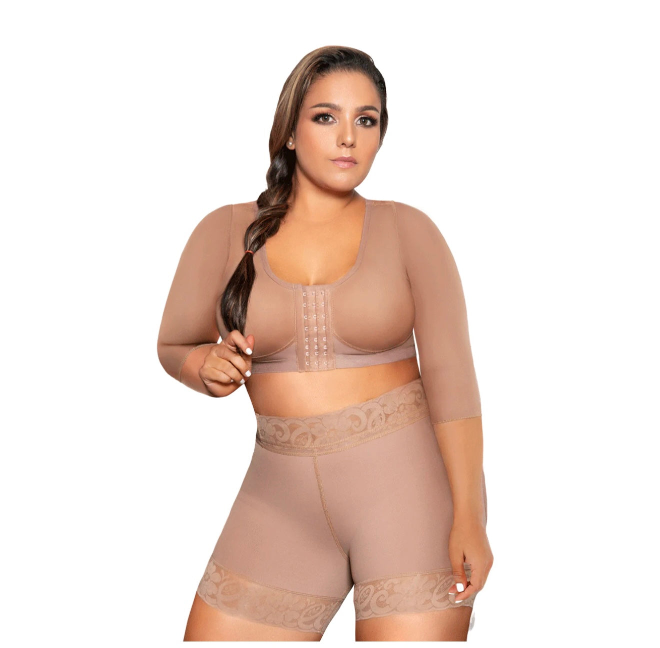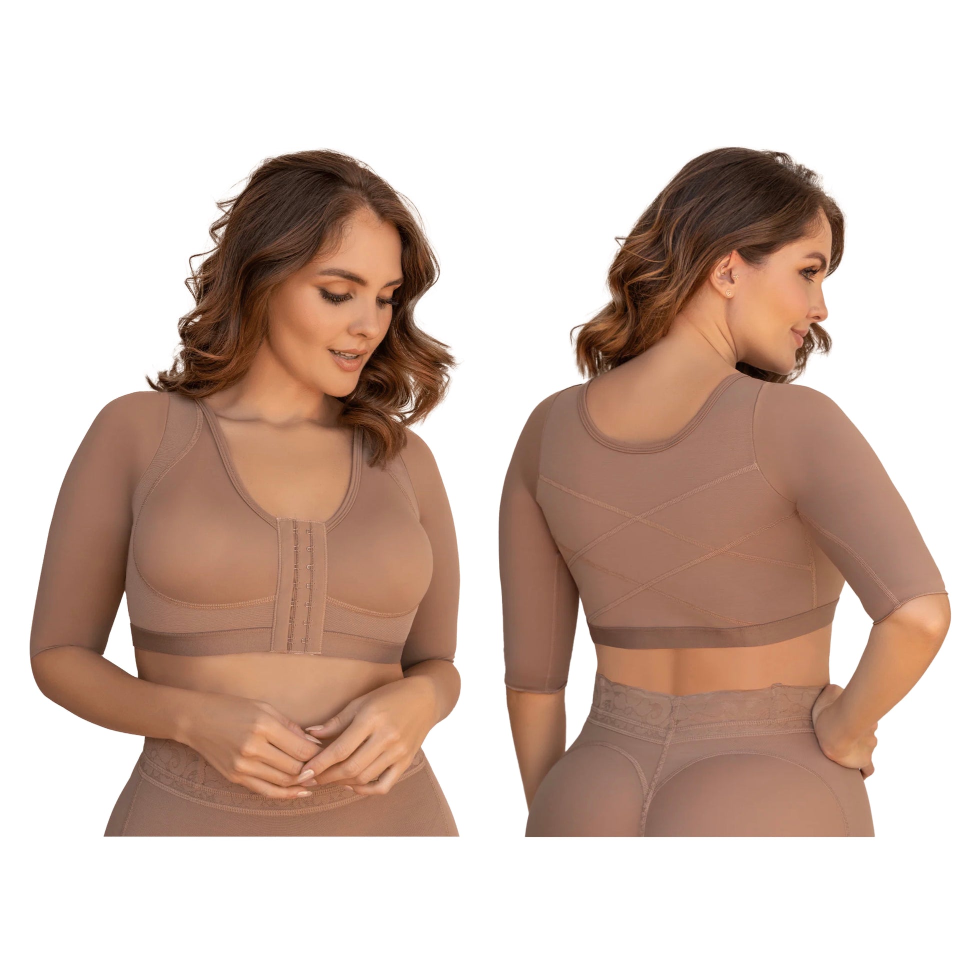 El sujetador posquirúrgico con mangas ofrece un soporte adicional para el busto y los brazos. Este diseño está pensado para ayudarla durante el proceso de curación de la cirugía de lifting de brazos.